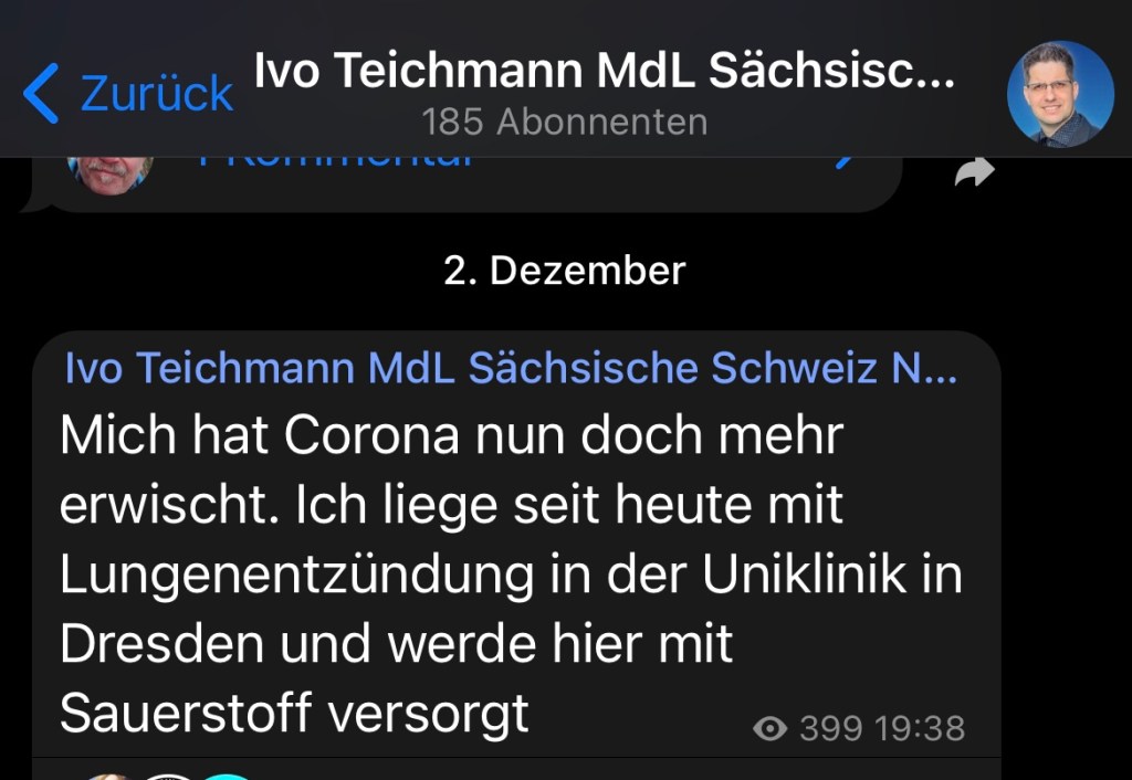 02.12.2021 – der AfD-Landtagsabgeordnete der sächsischen Schweiz hat Corona, liegt in der Klinik und bekommt Sauerstoff