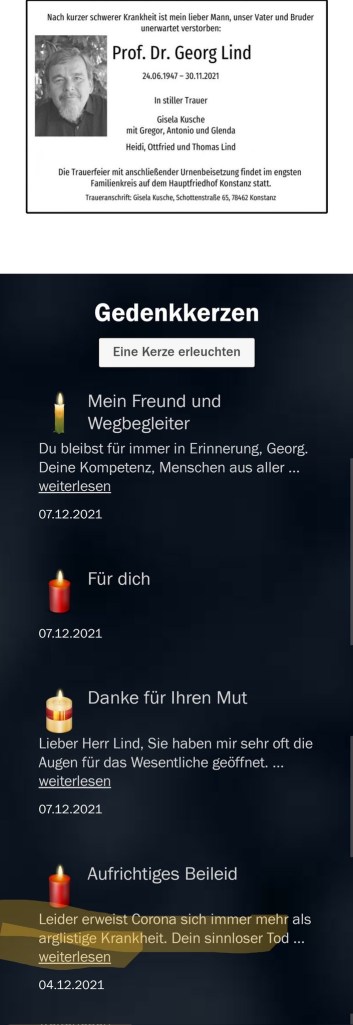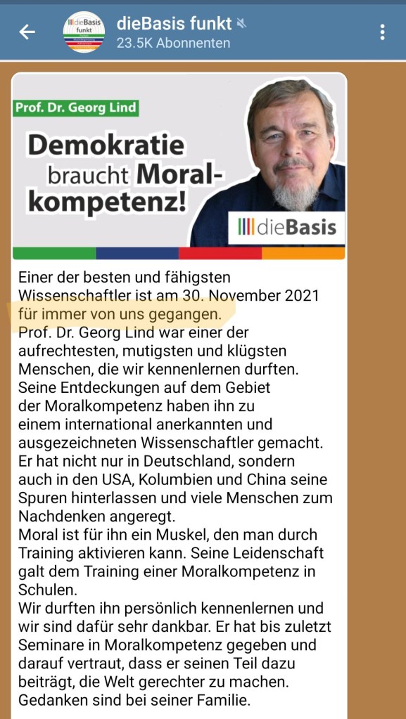 30.11.2021 – das Basismitglied Prof. Dr. Georg Lind ist an einer laut RA Ludwig „stärkeren Erkältung gestorben“ (Aussage im Video)