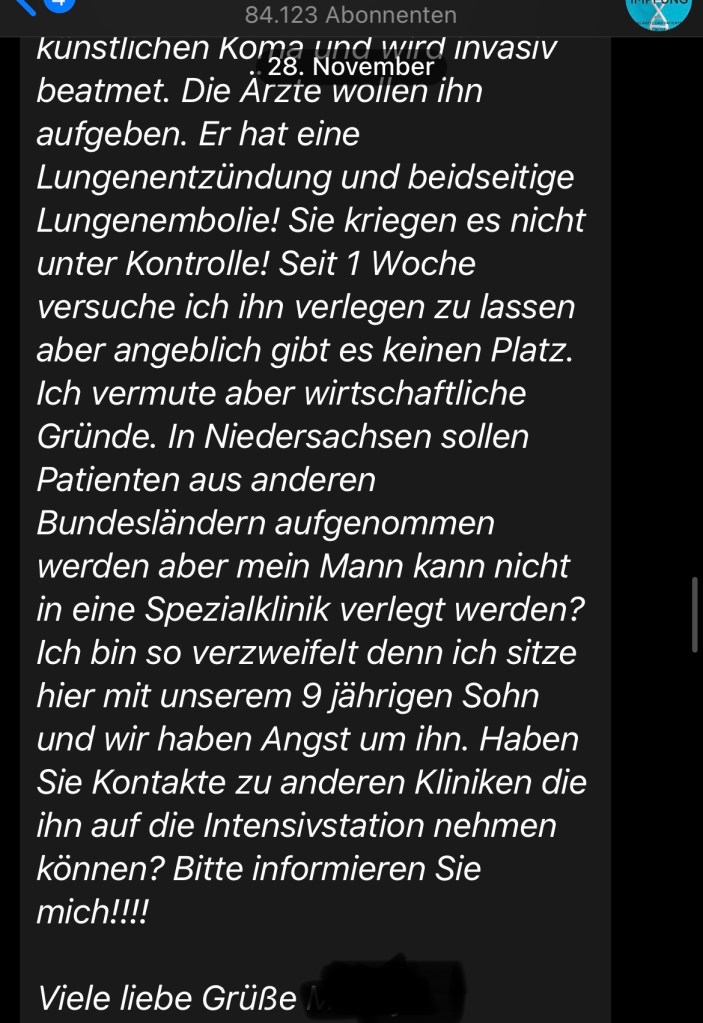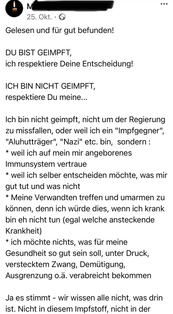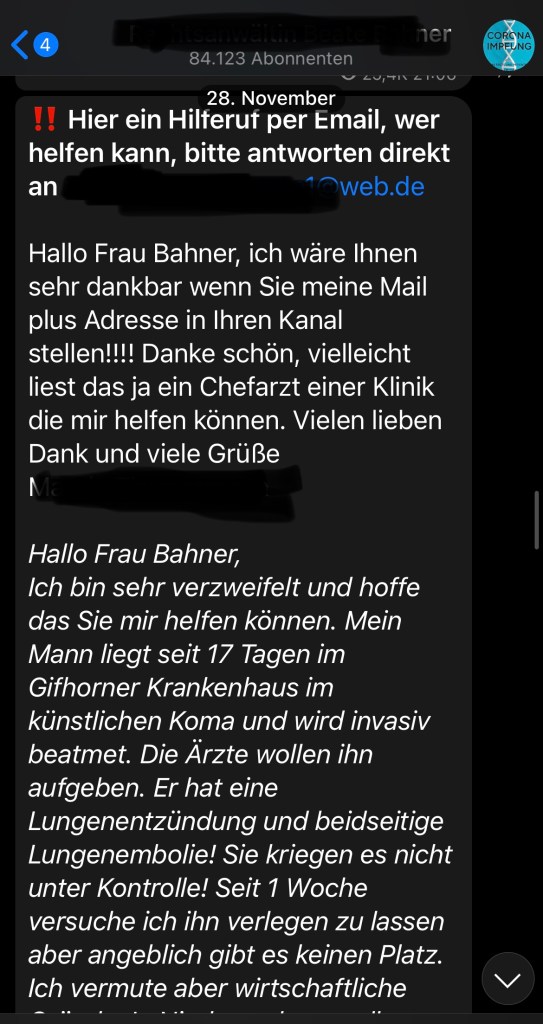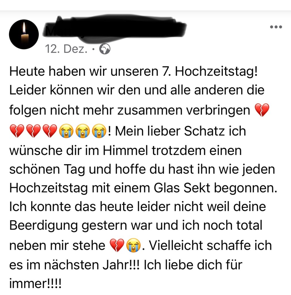 02.12.2021 – starb ein 54 Jähriger und hinterlässt eine Frau und einen 9 Jährigen Sohn. Seine Frau ist auf Telegram und Facebook unterwegs und auf Facebook teilt sie diverse Verschwörungstheorien, auch nach dem COVID-19-Tod ihres Mannes.